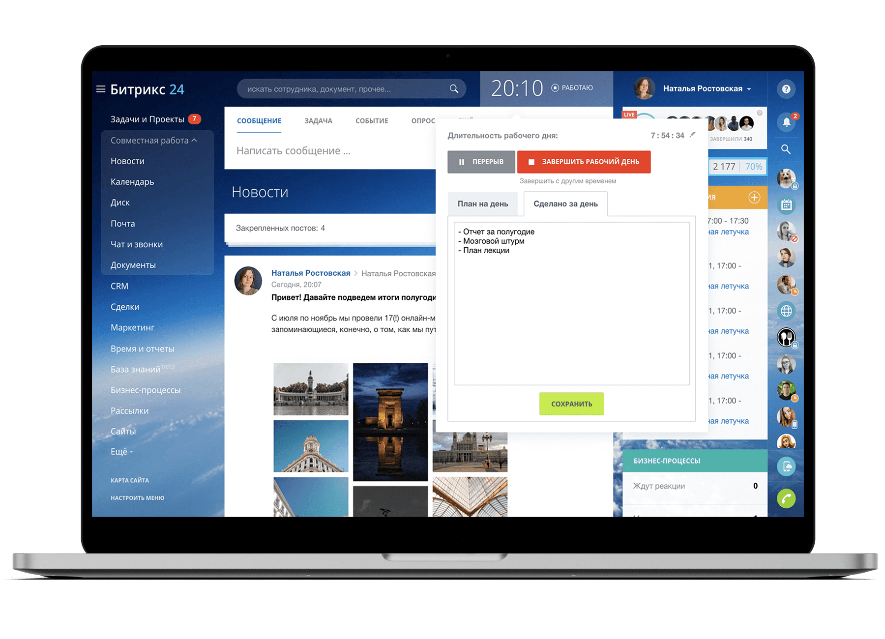 Новостная лента может стать местом, где кипит жизнь в компании. Прямо из поста создавайте задачи, проводите опросы, записывайте видеообращения.